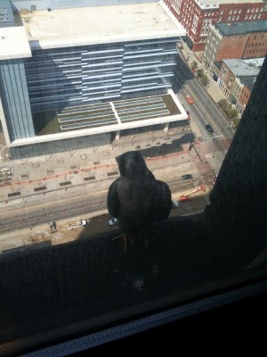 State Office Tower in Columbus, Ohio. Friday, September 10, 2010 Updates - This & That We heard recently that Boomer (C/66 hatched in Columbus in 2008), has taken over the nesting territory at the Terminal Tower in Cleveland! The last time he was seen in Columbus was at the end of June, 2008. He had at least one collision with a window after fledgling so it is great to know that he has since fared well. Click here to review the fledging info from 2008. Be sure and check out the Cleveland Museum of Natural History's FalconCam coverage of the Terminal Tower nest and the associated falcon forums. Durand and Trooper have both been making appearances at the nestbox every day or so and while there they have been demonstrating pair bonding behavior (bowing and vocalizing to each other). This activity is in preparation for next year: we are well beyond nesting season this year so there is no chance of another nest attempt in 2010. Both birds have also been working on the scrape in the gravel - again, this is bonding to/claiming of the site as theirs in preparation for next spring. We also had a separate report of Durand "buzzing" around the 25th and 26th floors of the Franklin County Courthouse. Thanks to the Human Resources staff at the courthouse for snapping and sharing this photo of her on a window ledge taken on Tuesday, September 7, 2010!  Camera Update: In this the off-season we have begun experimenting with different camera settings to see if we can tweak the system to provide better viewing in late day conditions when the sun is in the west and the nestbox is in shadow. Bright sun shining towards the camera combined with a dark corner of the ledge confuses the iris of the camera and results in the dark corner being too dark to see any detail. The process of adjusting camera settings is by trial and error so expect that sometimes the image may not be ideal if the settings are not correct-viewers may notice the image being extremely bright or dark. Each time a setting is changed we will leave it for at least 24 hours to see how the image looks at different times of day/in different lighting conditions. We appreciate every one's patience as we work through this process of fine tuning the settings with the ultimate goal to make viewing our site more enjoyable in the long run. Finally, the investigation concerning Scout's death is still ongoing. State and Federal investigators take the matter very seriously and are cooperating fully. Information, when available to the public, will be posted here on the blog but these matters can sometimes take a very long time to get through. No details or information can be disclosed until the matter is fully closed otherwise risk compromising the investigation. Thanks for your patience and thanks for watching the Columbus Falcons!