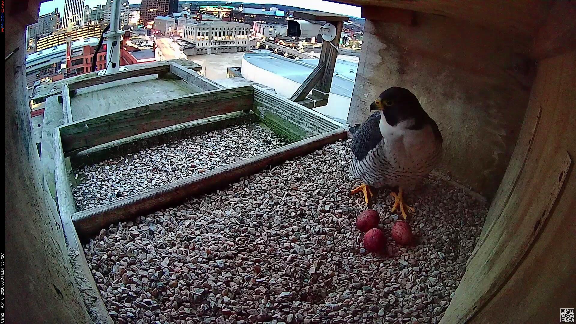 At 5:09 am, Corazon came into the nest box to see the newest arrival and give Nova a break. Nova took off and Corazon attempted to cover all three eggs. It took a bit of maneuvering, but he finally got it!