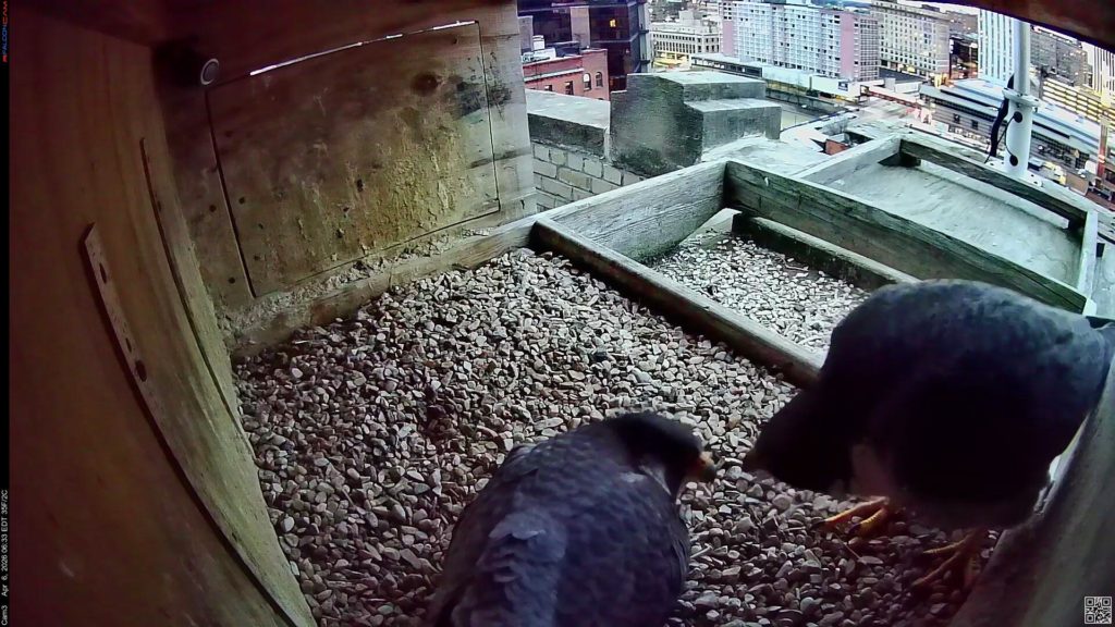 Nova returned and had quite the conversation with Corazon, We call these stand-offs! Over the years, our Tiercels (males) sometimes are very stubborn and don’t want to leave their eggs. Nova was quite insistent and Corazon finally stood up and left.
